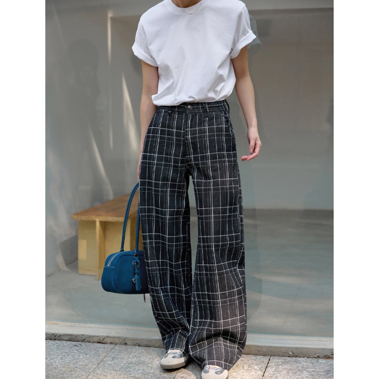 抜け感たっぷりのチェックストレートワイドパンツ。