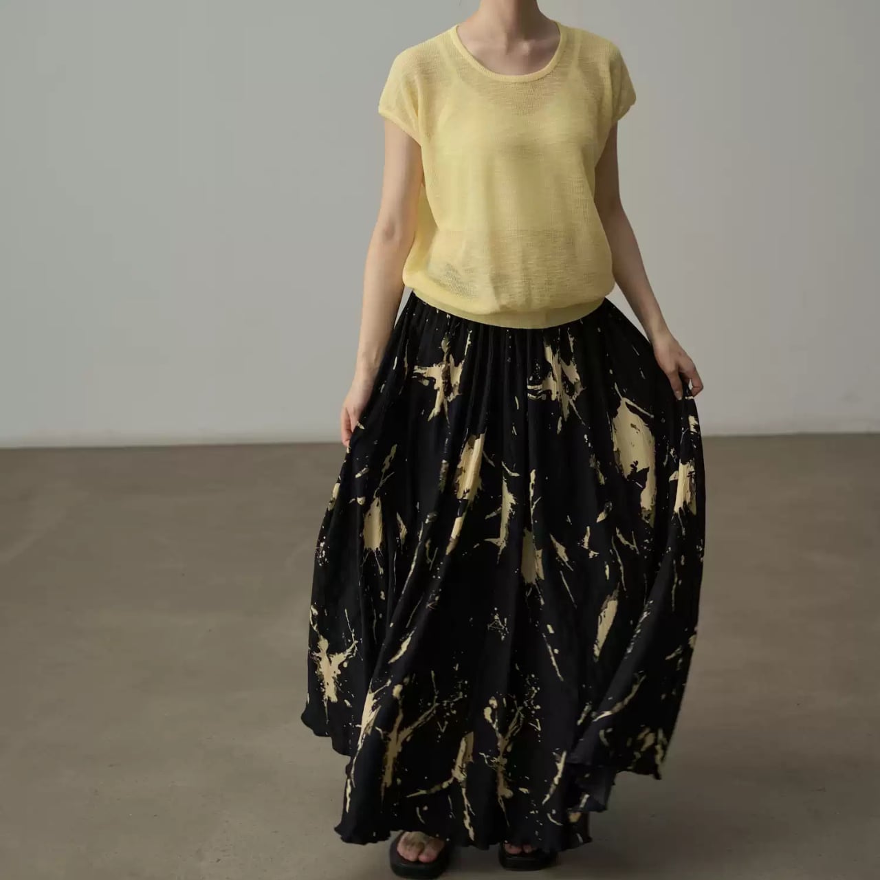 視線を惹きつける大胆なアート柄が特徴のロングスカート。