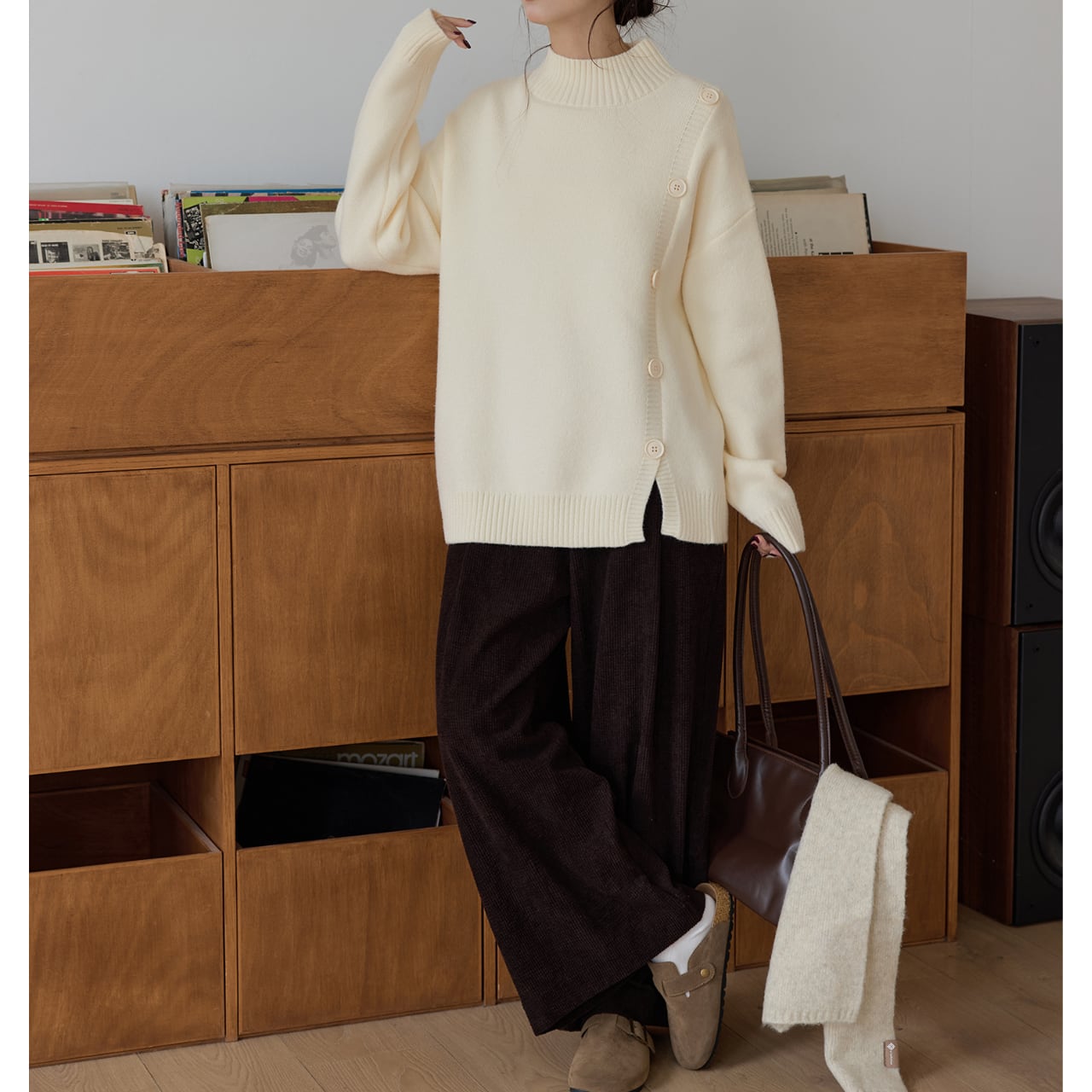 最大の特徴は、前身頃の斜めに配されたデザインボタン。
