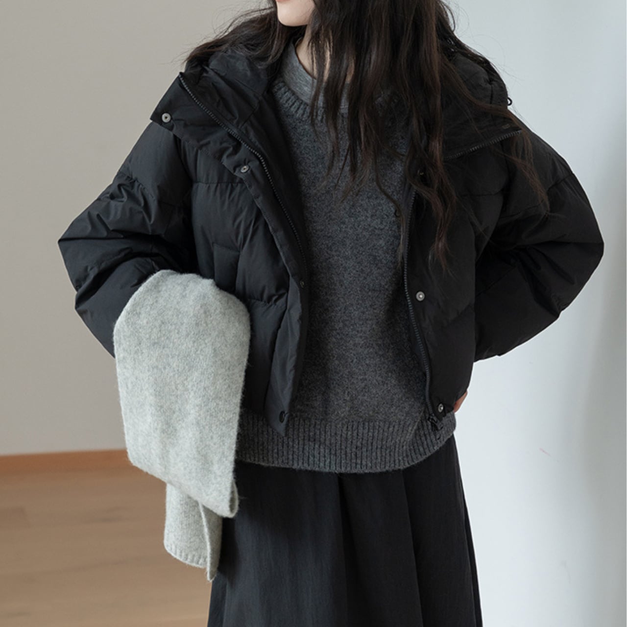 首元をすっぽりと覆う大きめの襟とフードのデザインが、