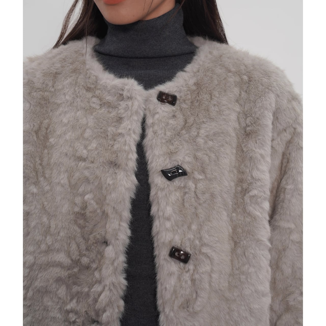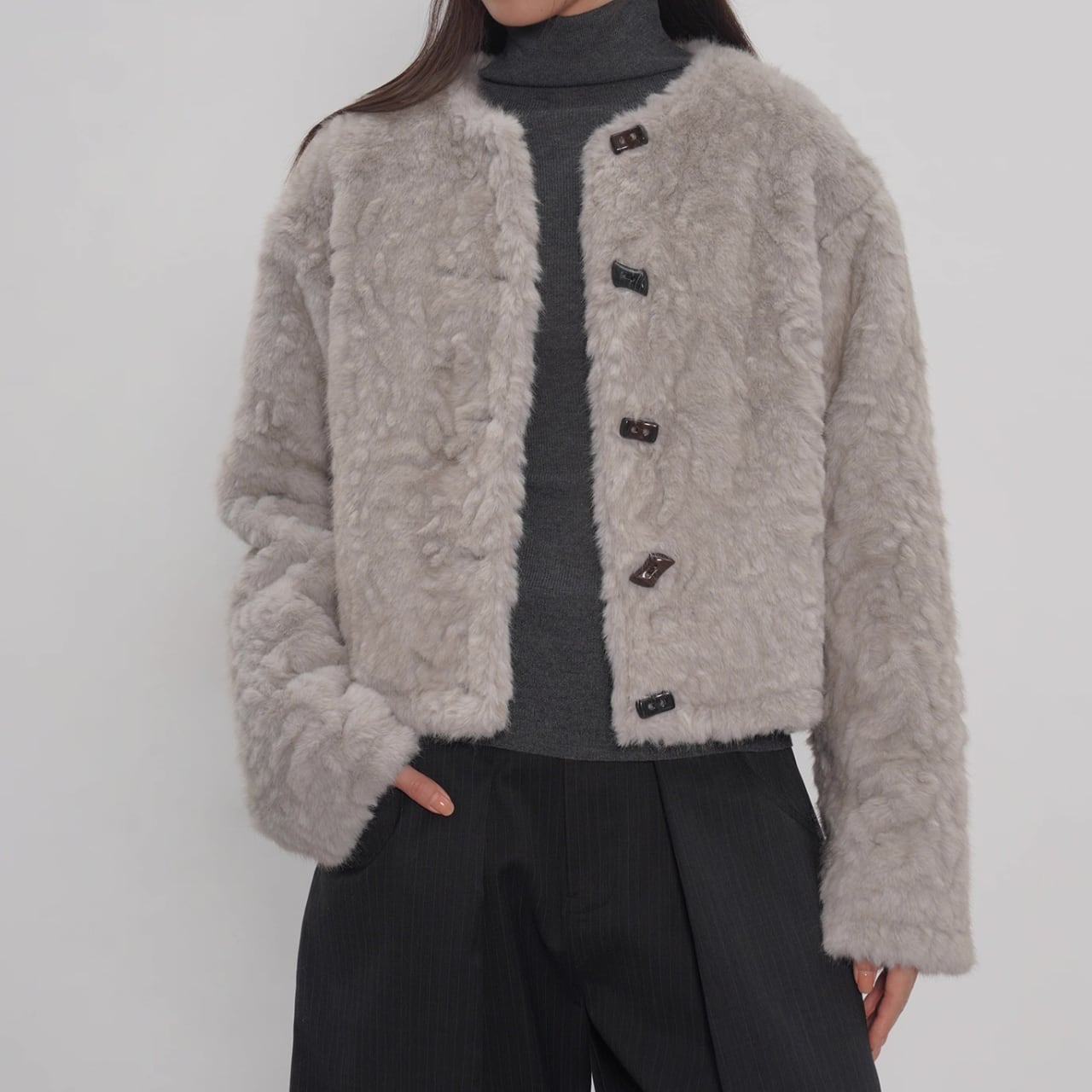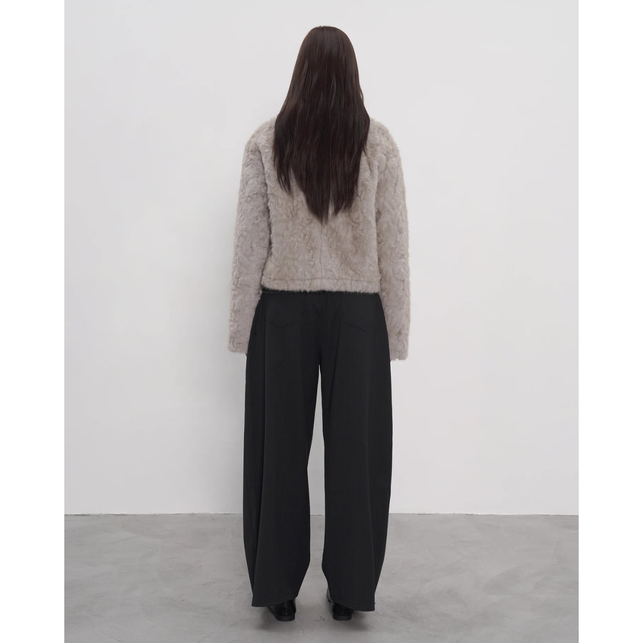 ノーカラー(襟なし)デザインが首元をすっきりと見せ、