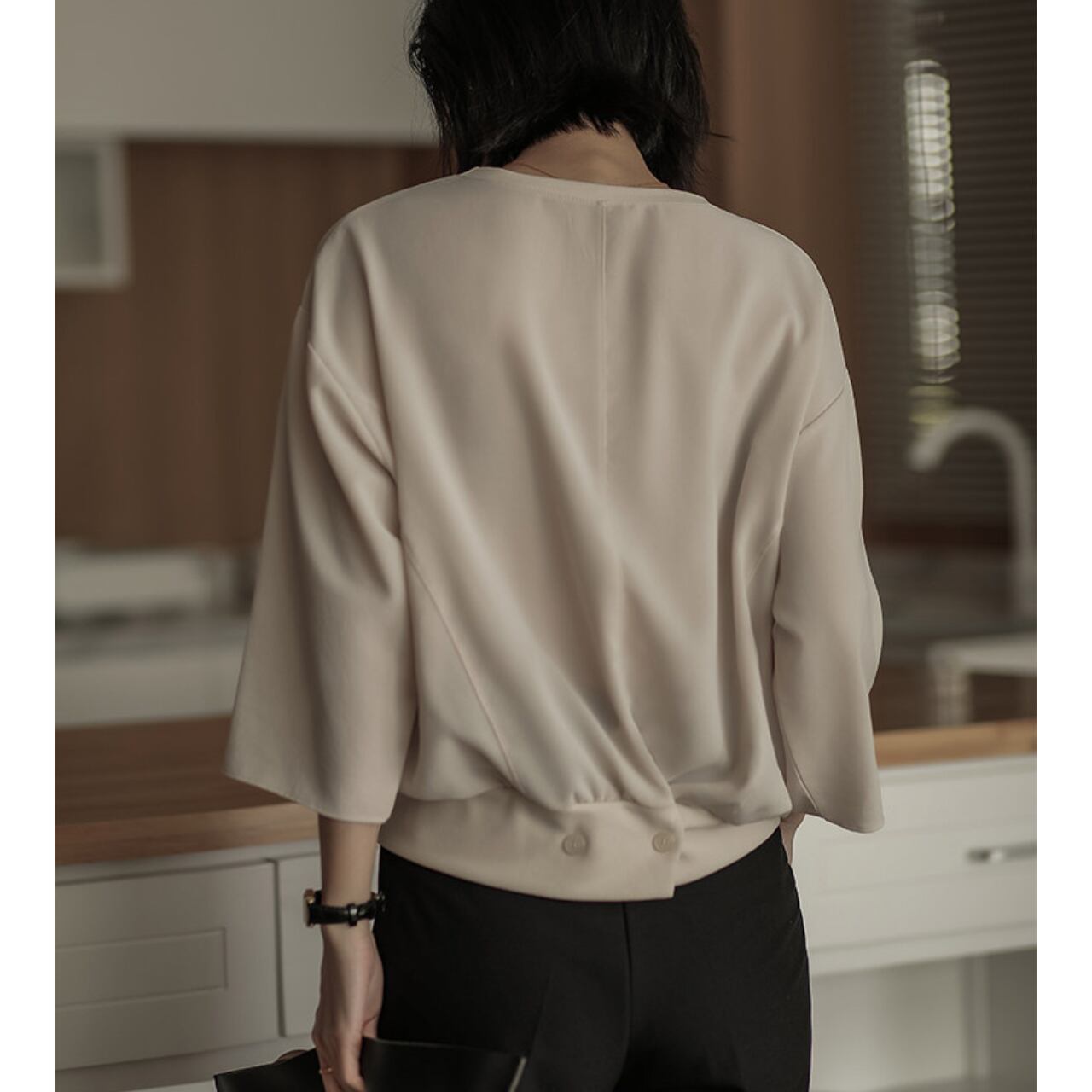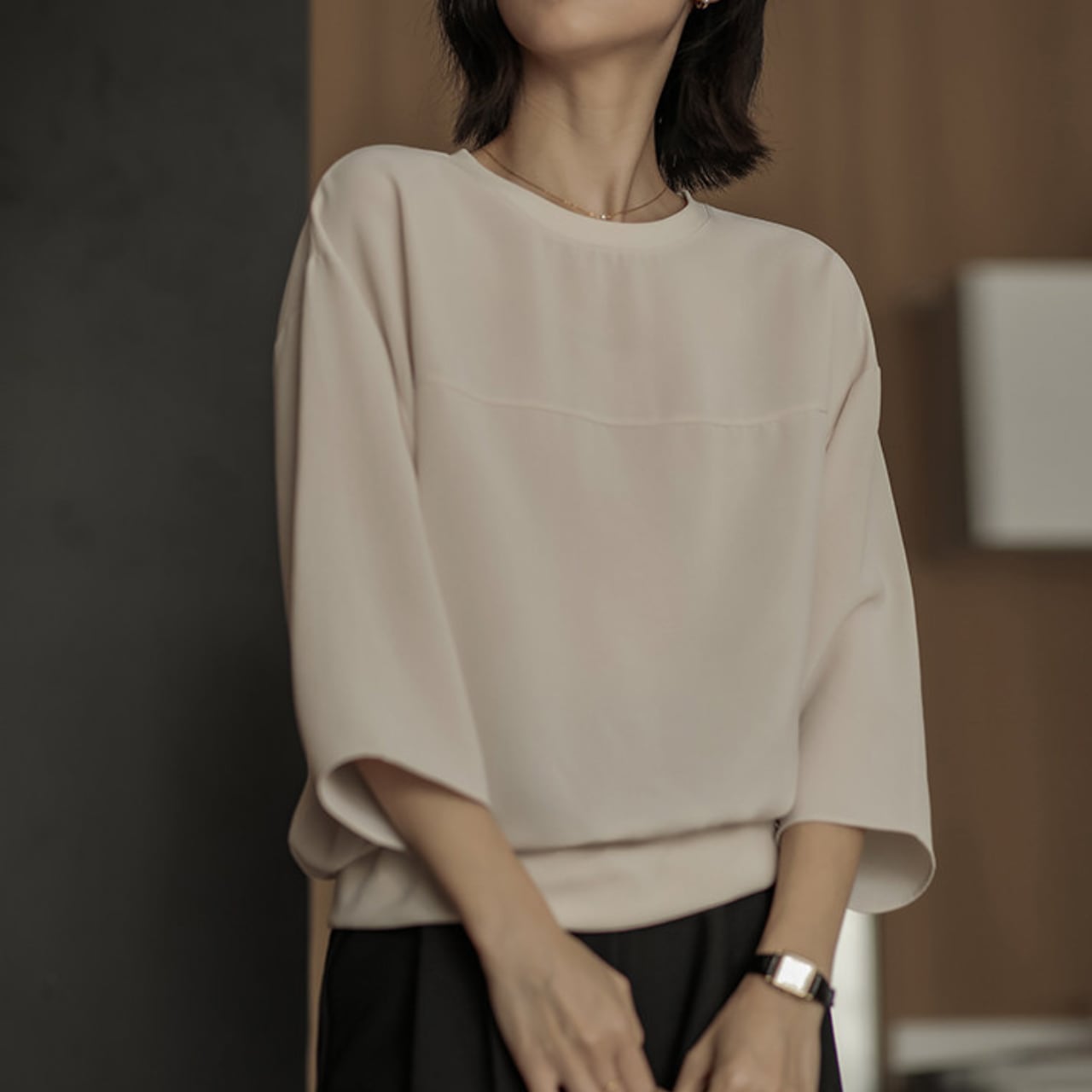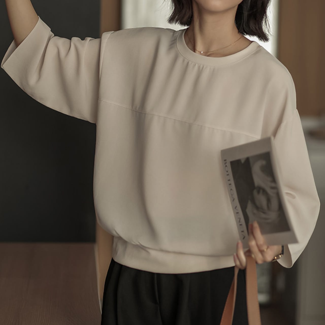 フロントを横切るステッチデザインと、ワイドに広がる袖のバランスが、