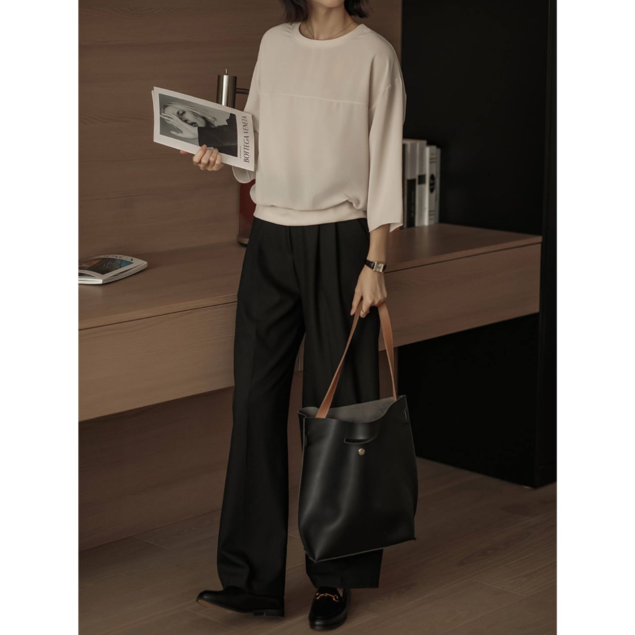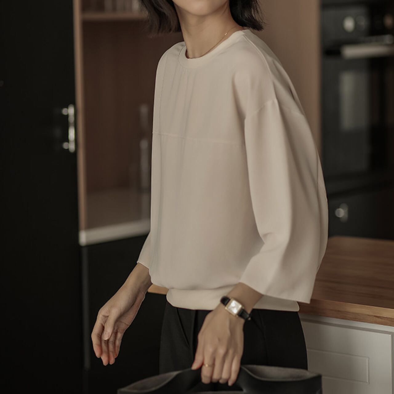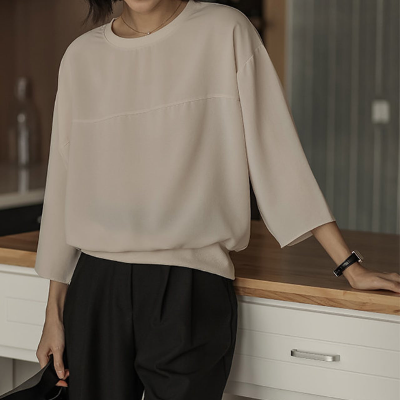 フロントを横切るステッチデザインと、ワイドに広がる袖のバランスが、