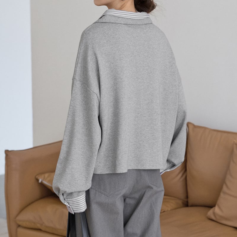 ストライプシャツを重ね着したような襟元と袖口のディテールが、