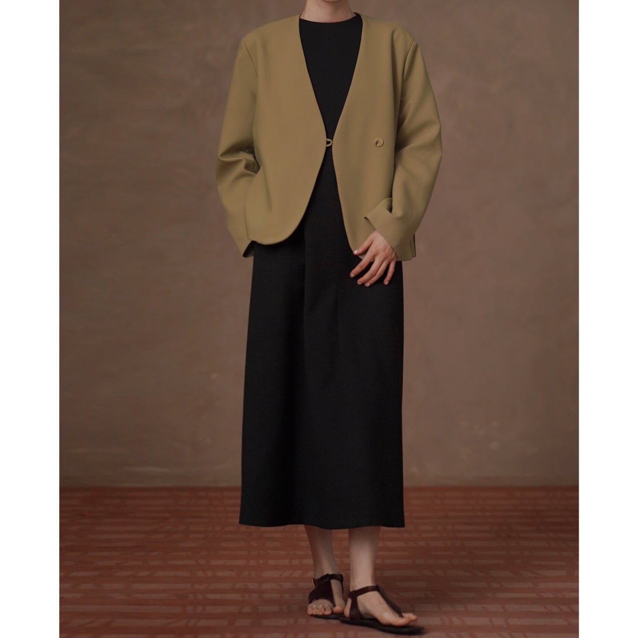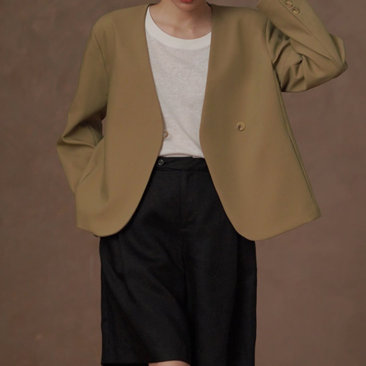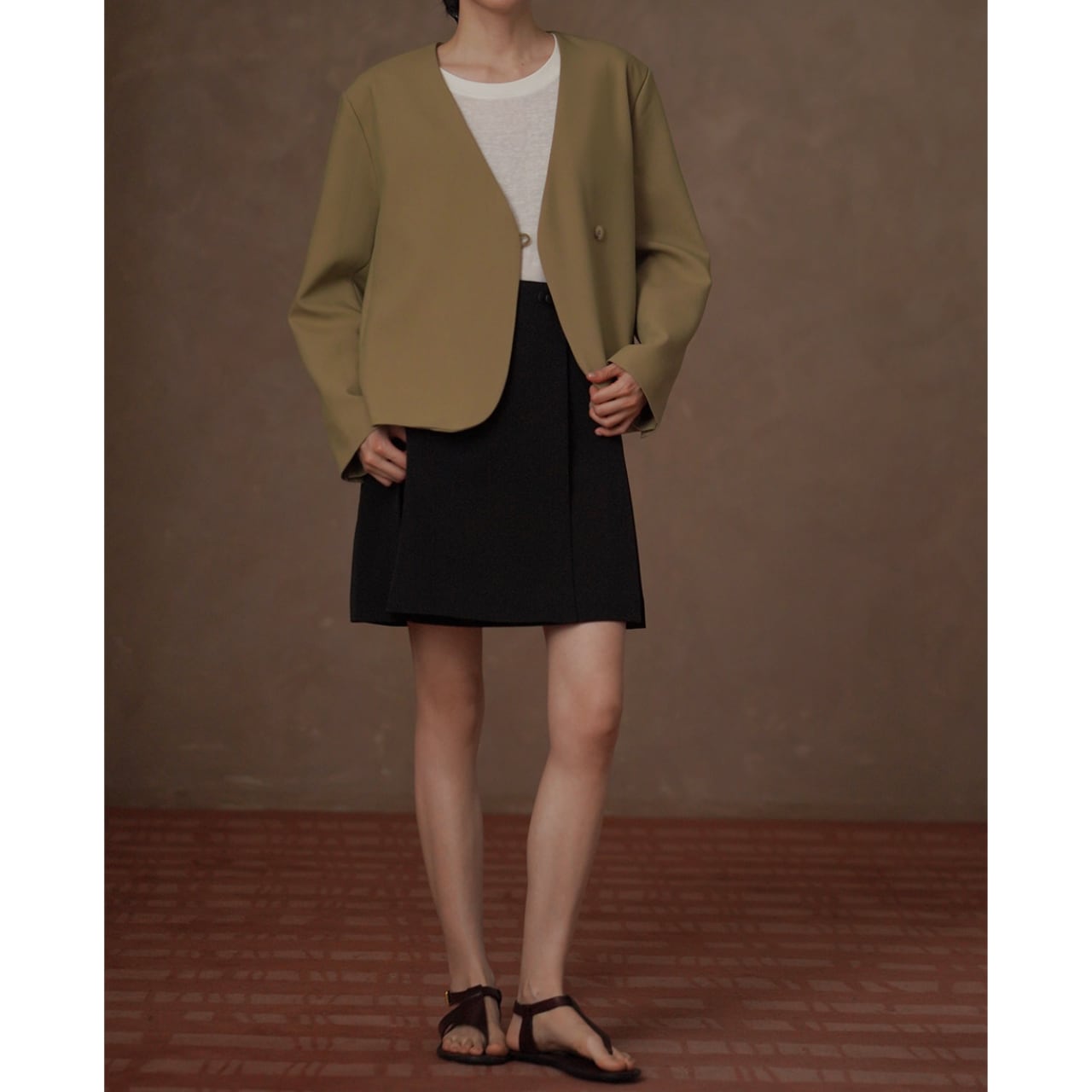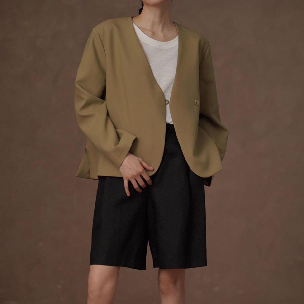 アシンメトリーボタンノーカラーVネックジャケット 3589