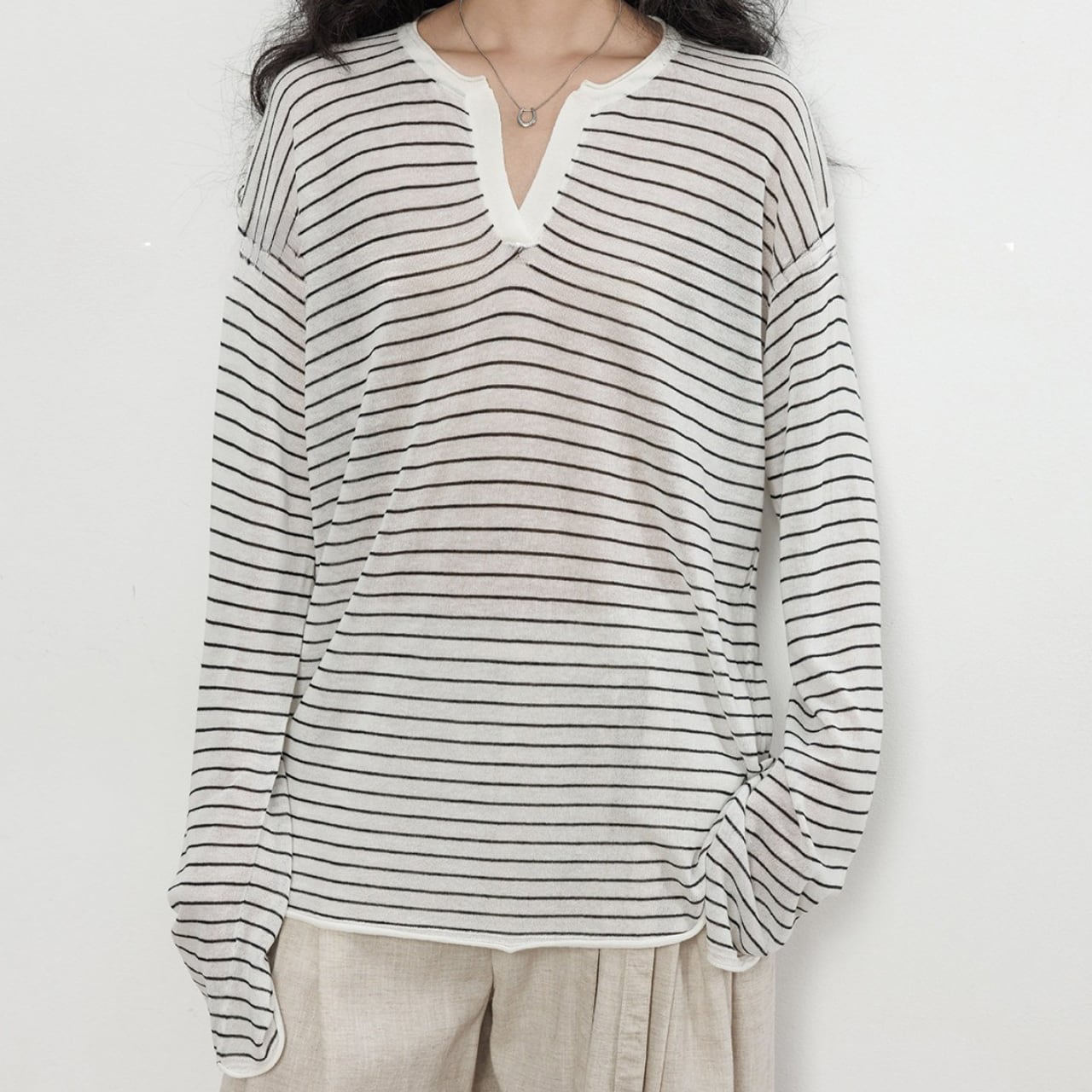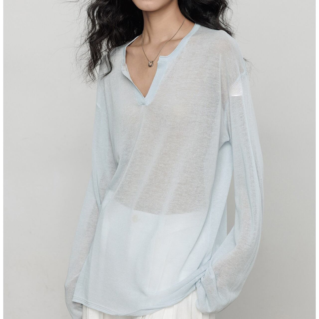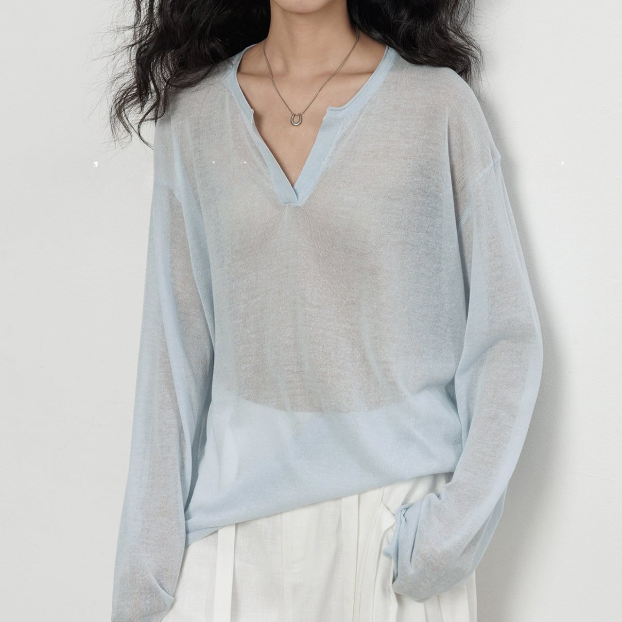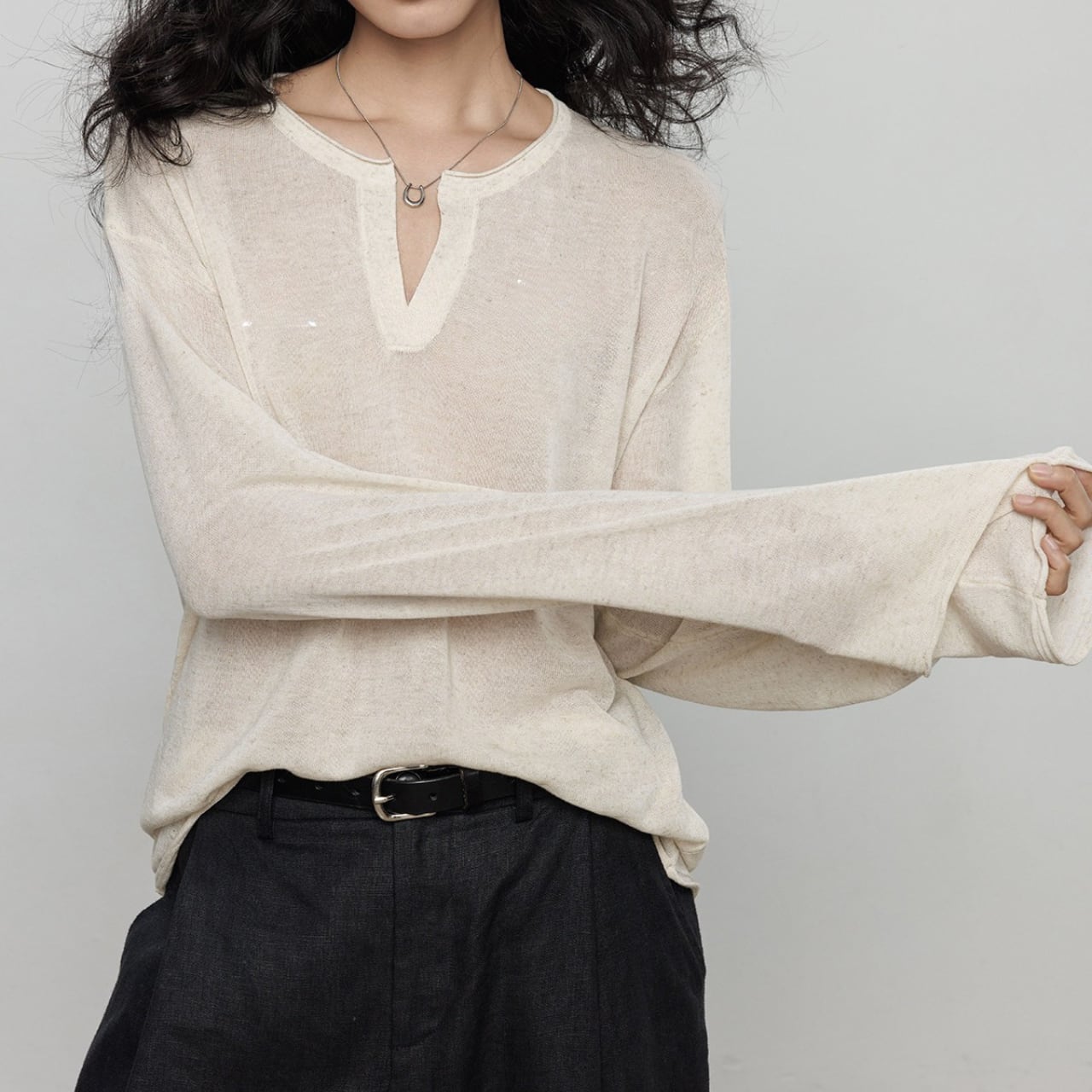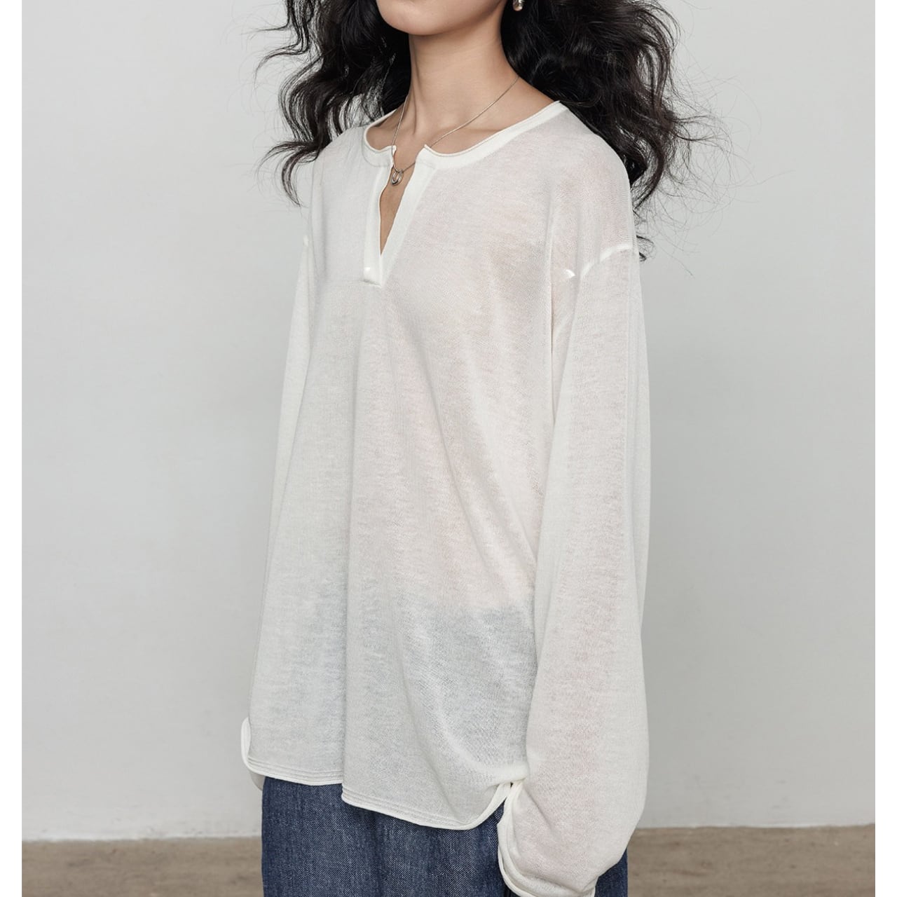 首元は深めのキーネックデザインで、お顔周りをスッキリと見せ、