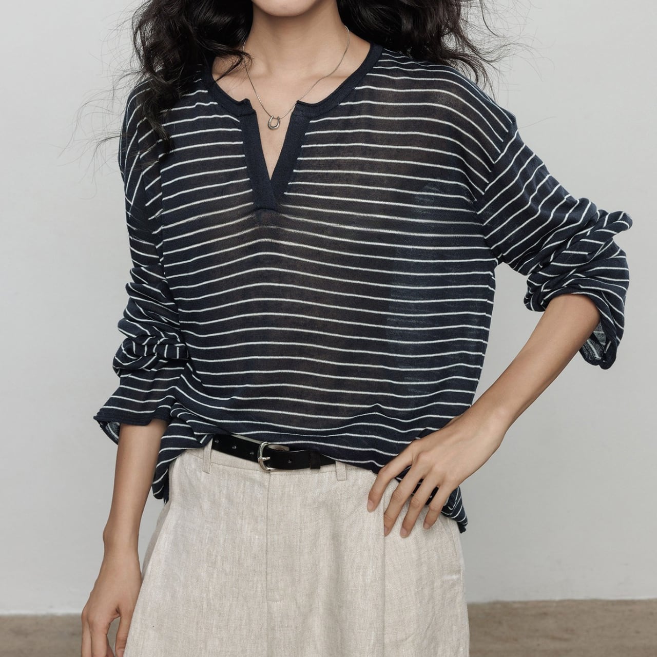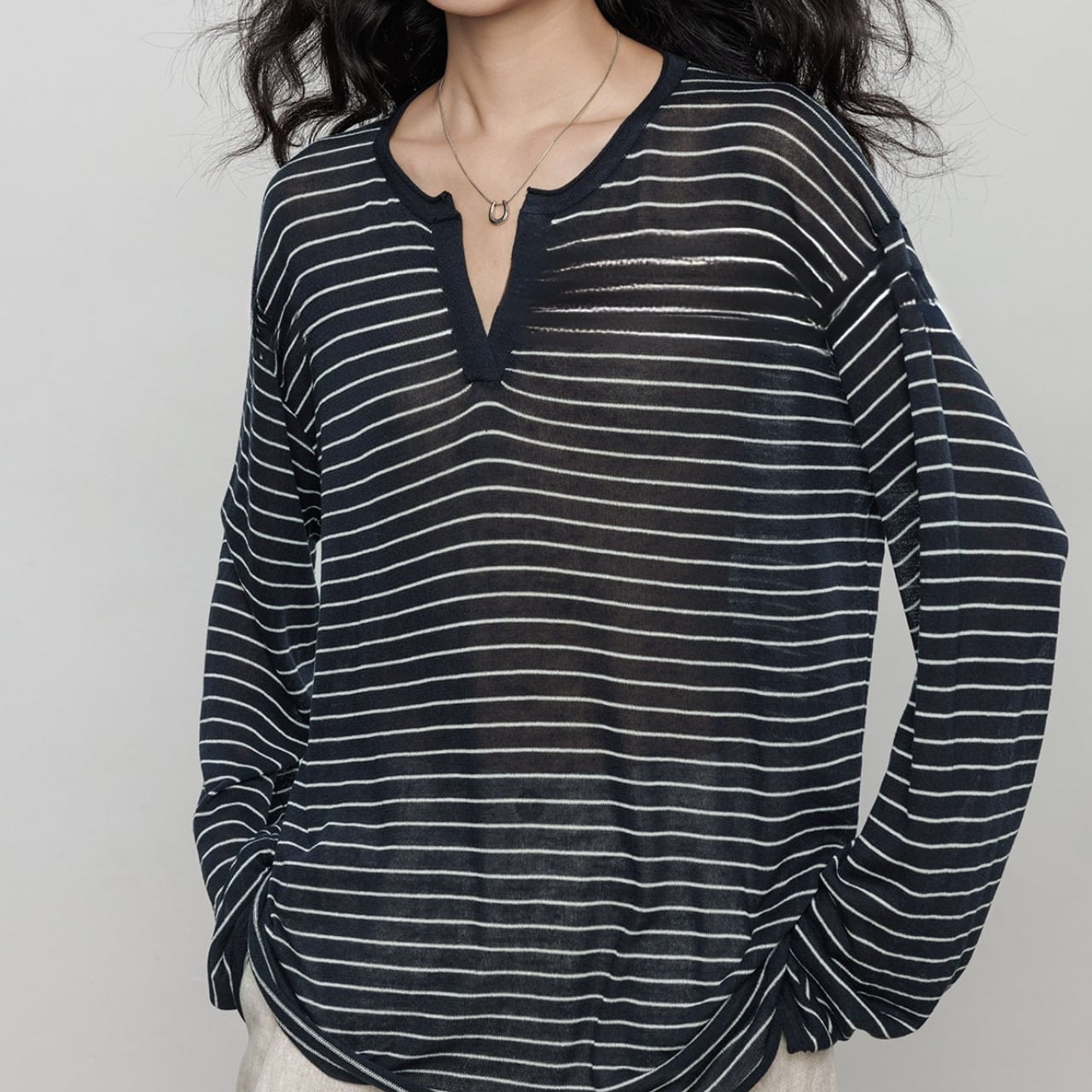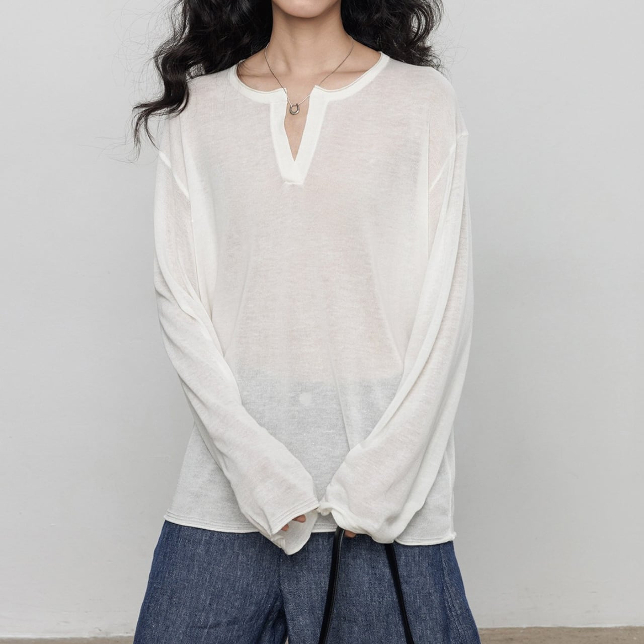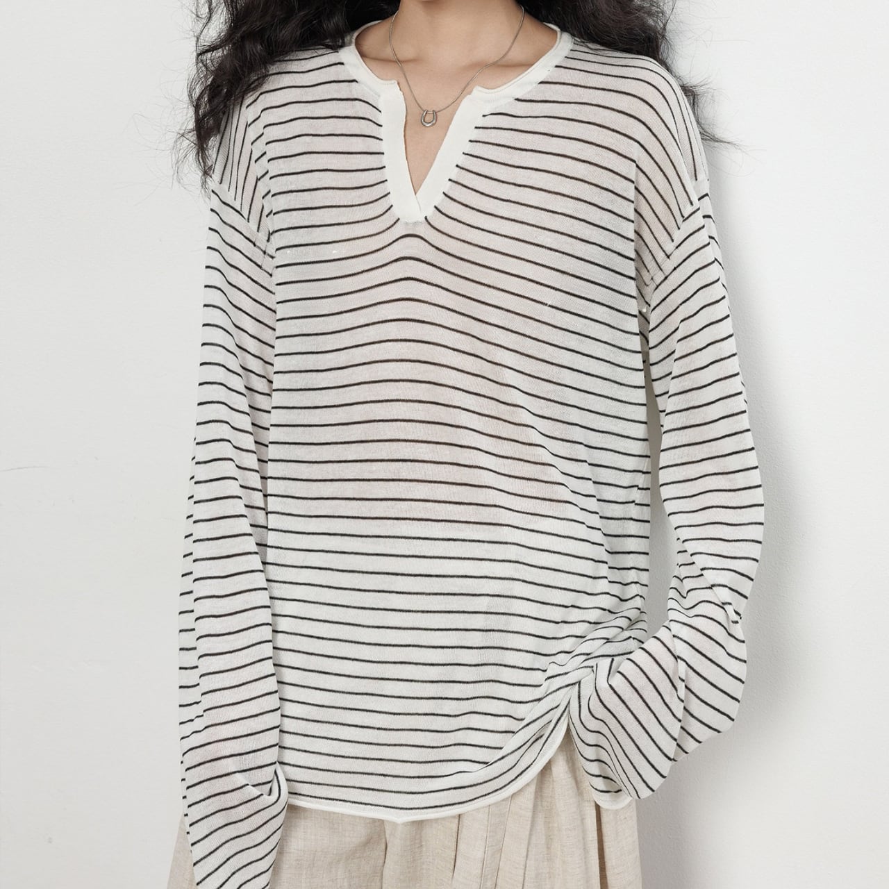首元は深めのキーネックデザインで、お顔周りをスッキリと見せ、
