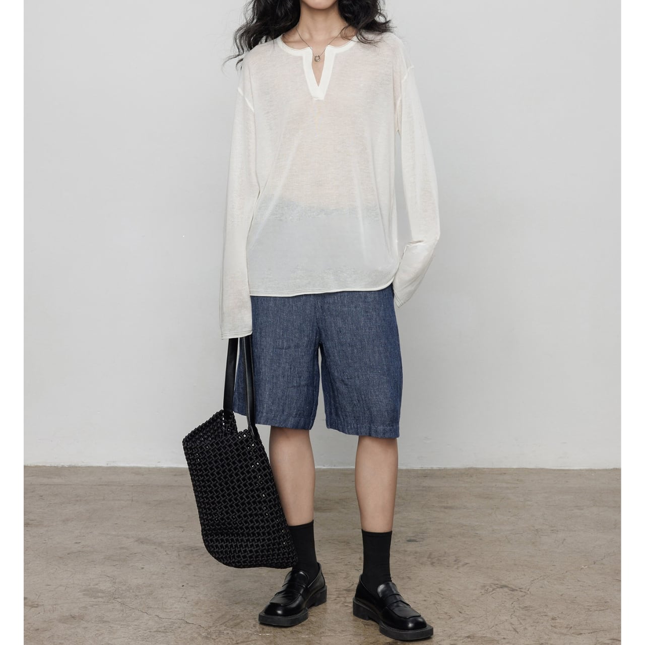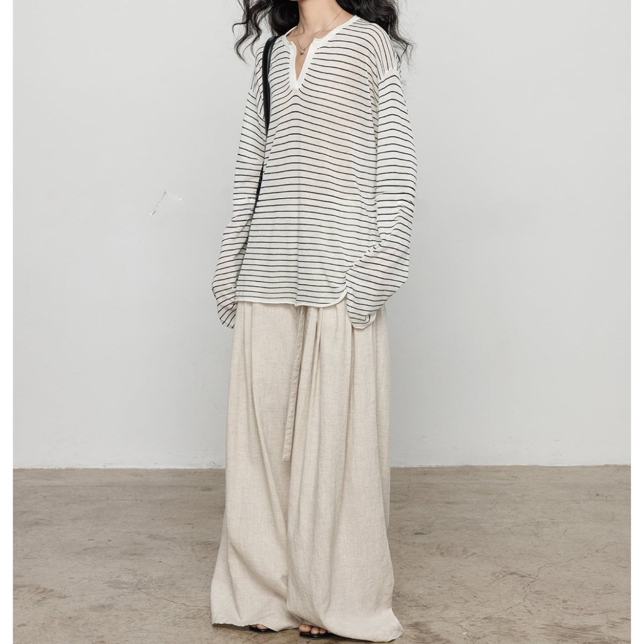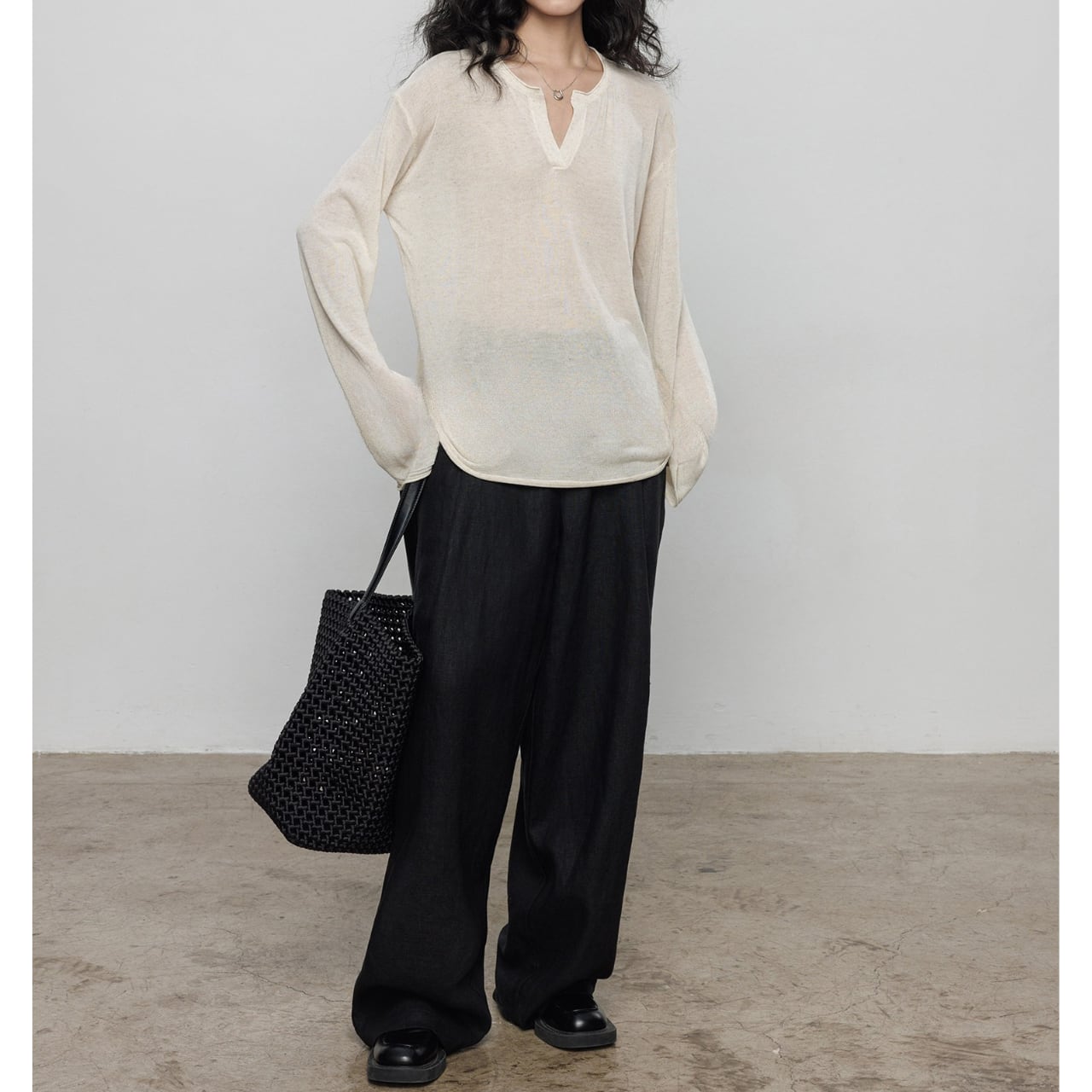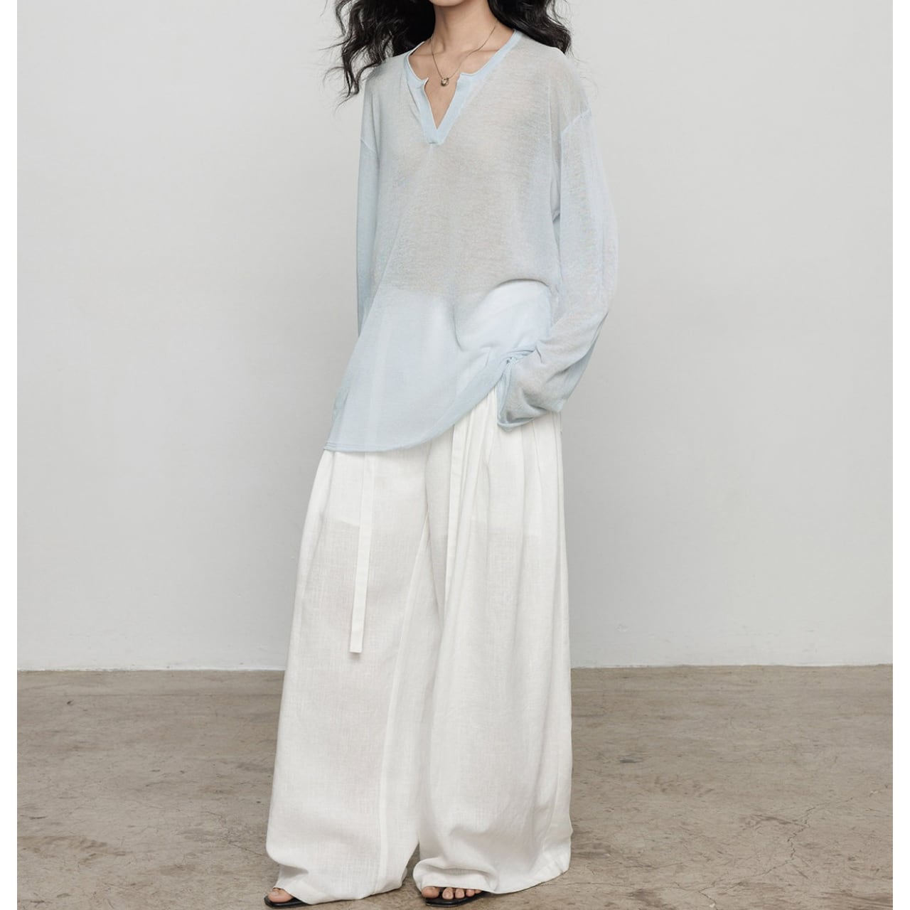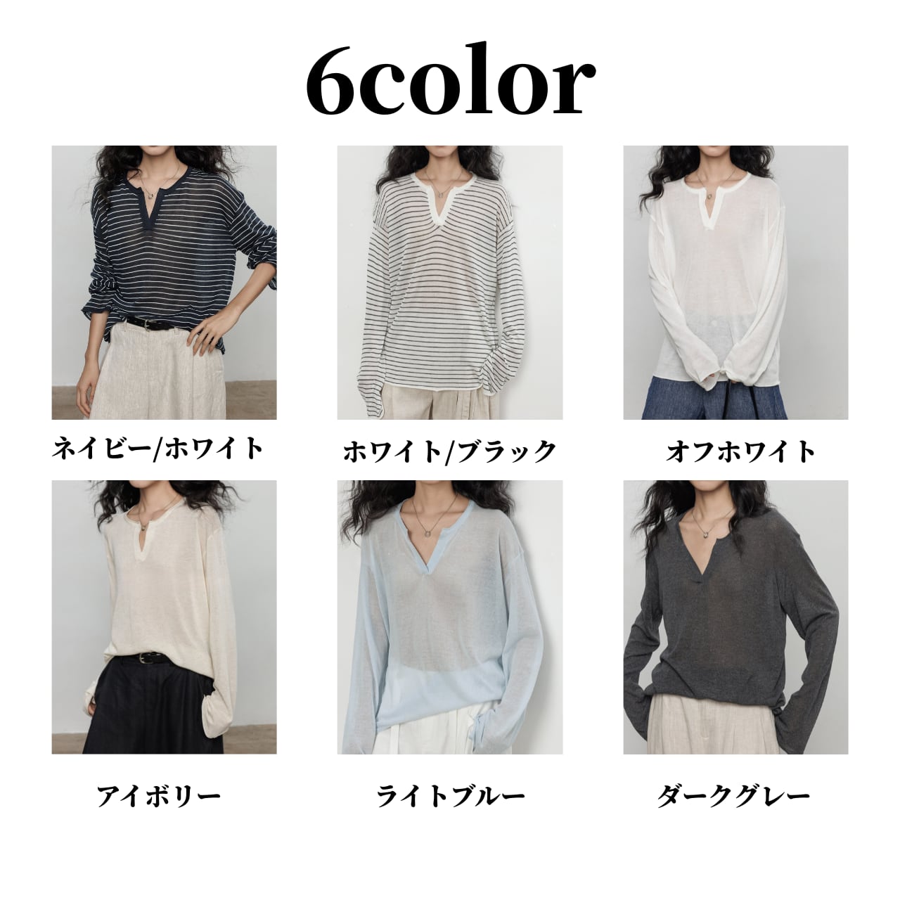 首元は深めのキーネックデザインで、お顔周りをスッキリと見せ、