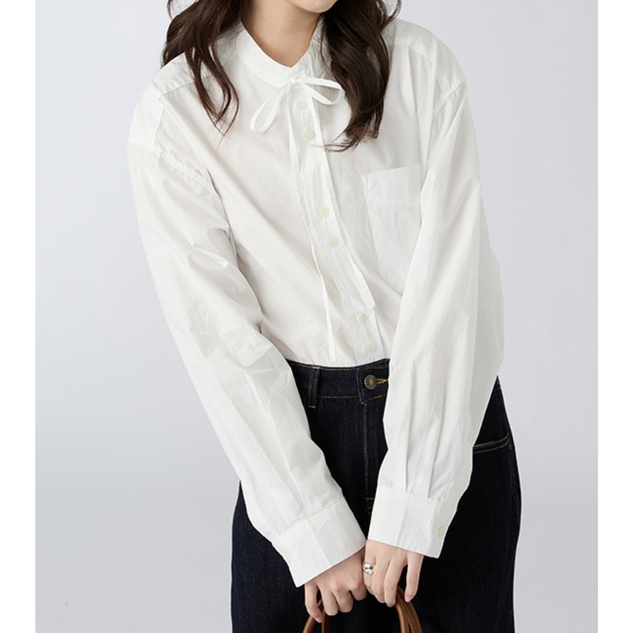 シンプルながらも華やかさをプラスするリボンタイシャツブラウス。